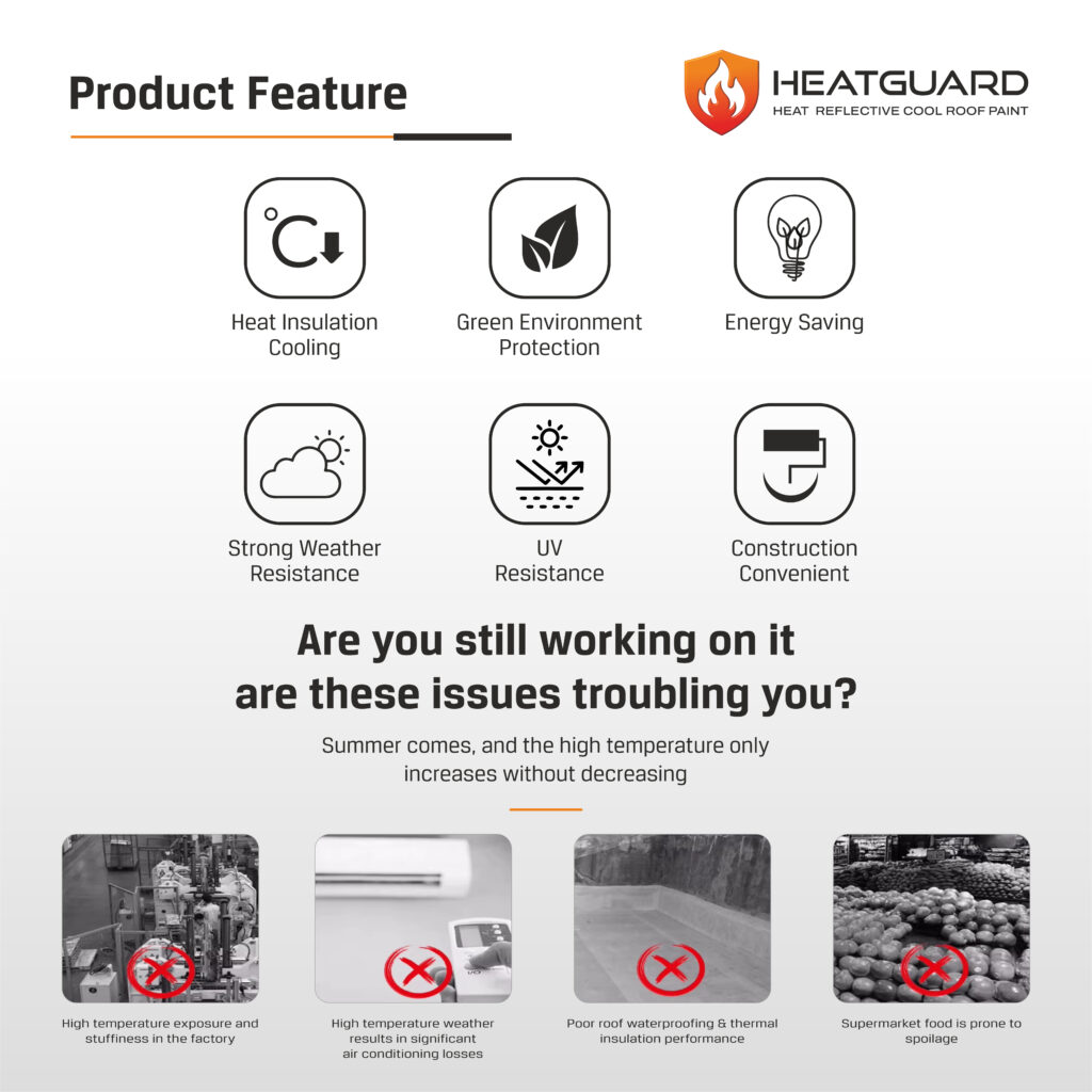 HEATGUARD is a high-performance, imported heat-reflective and thermal insulation waterproof coating. It provides quadruple insulation and cooling, allowing the surface to drop temperatures significantly.