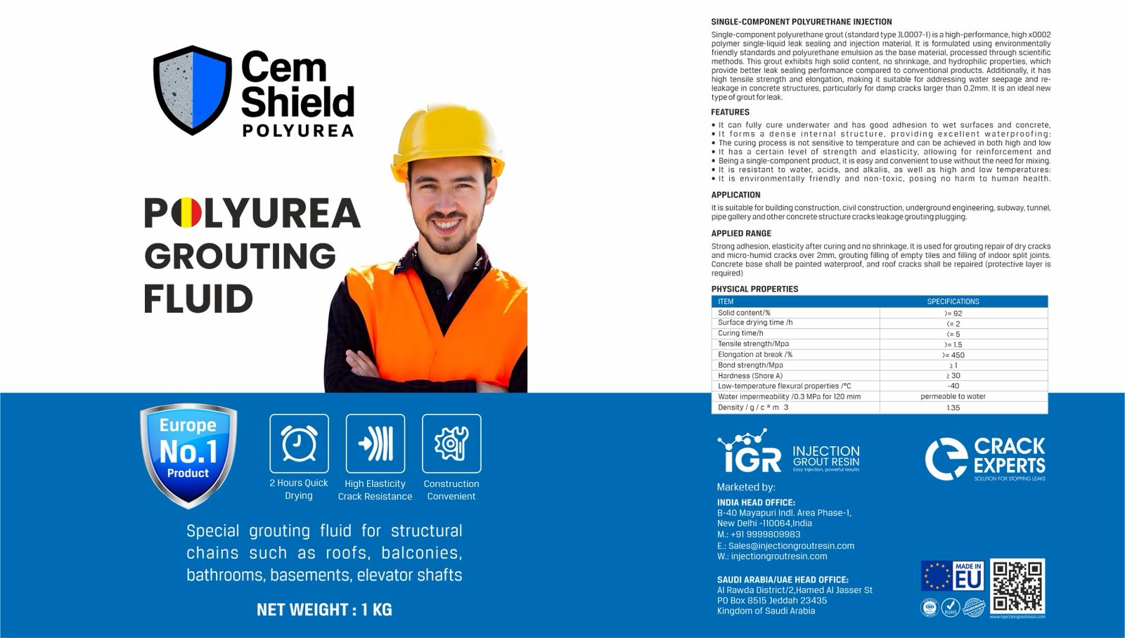 Read moreCrackexpert PU-201 is a two-component (2K), CFC-free polyurethane polyol for injection grouting, which rapidly foams up irrespective of water contact in water-filled cracks/voids to quickly seal water flow.