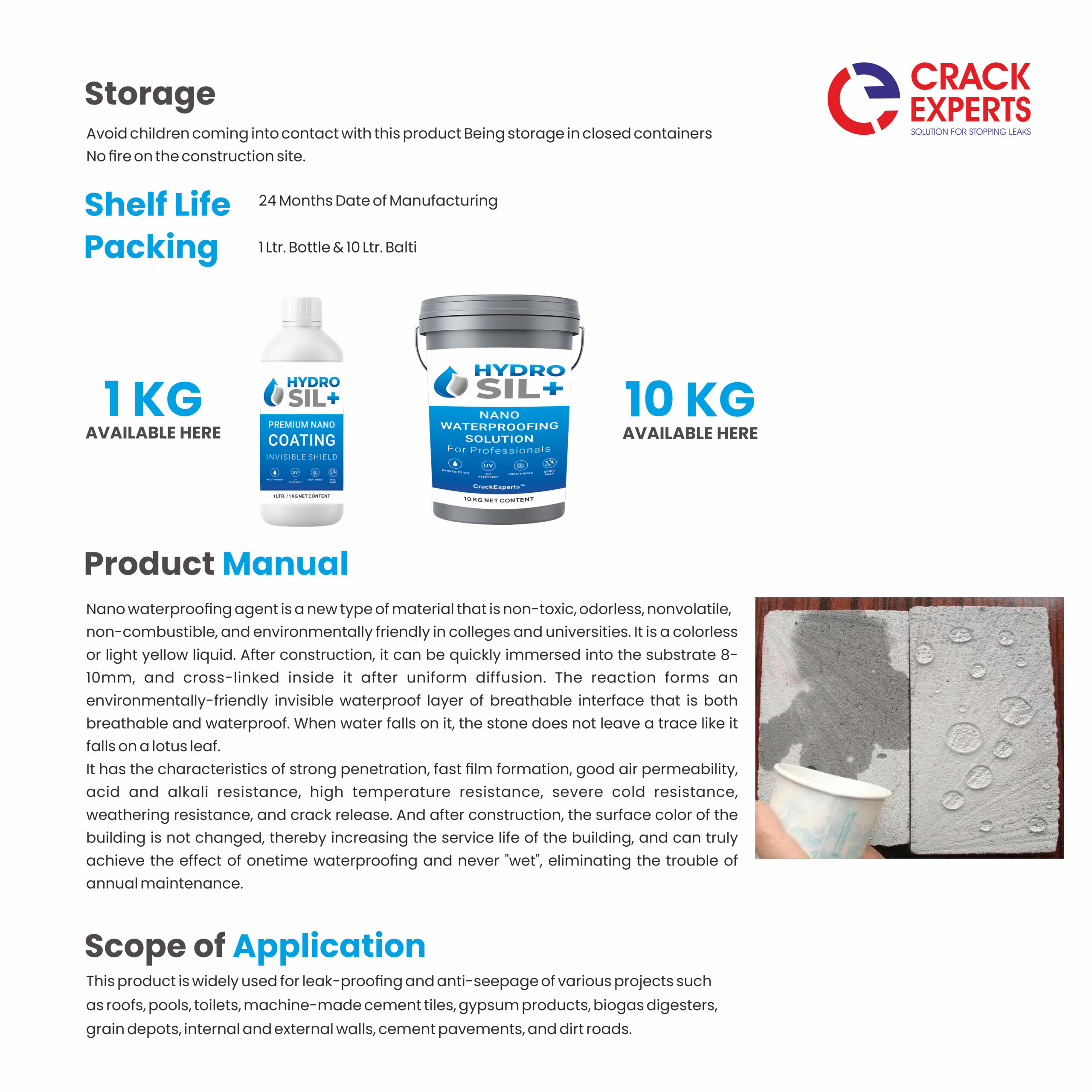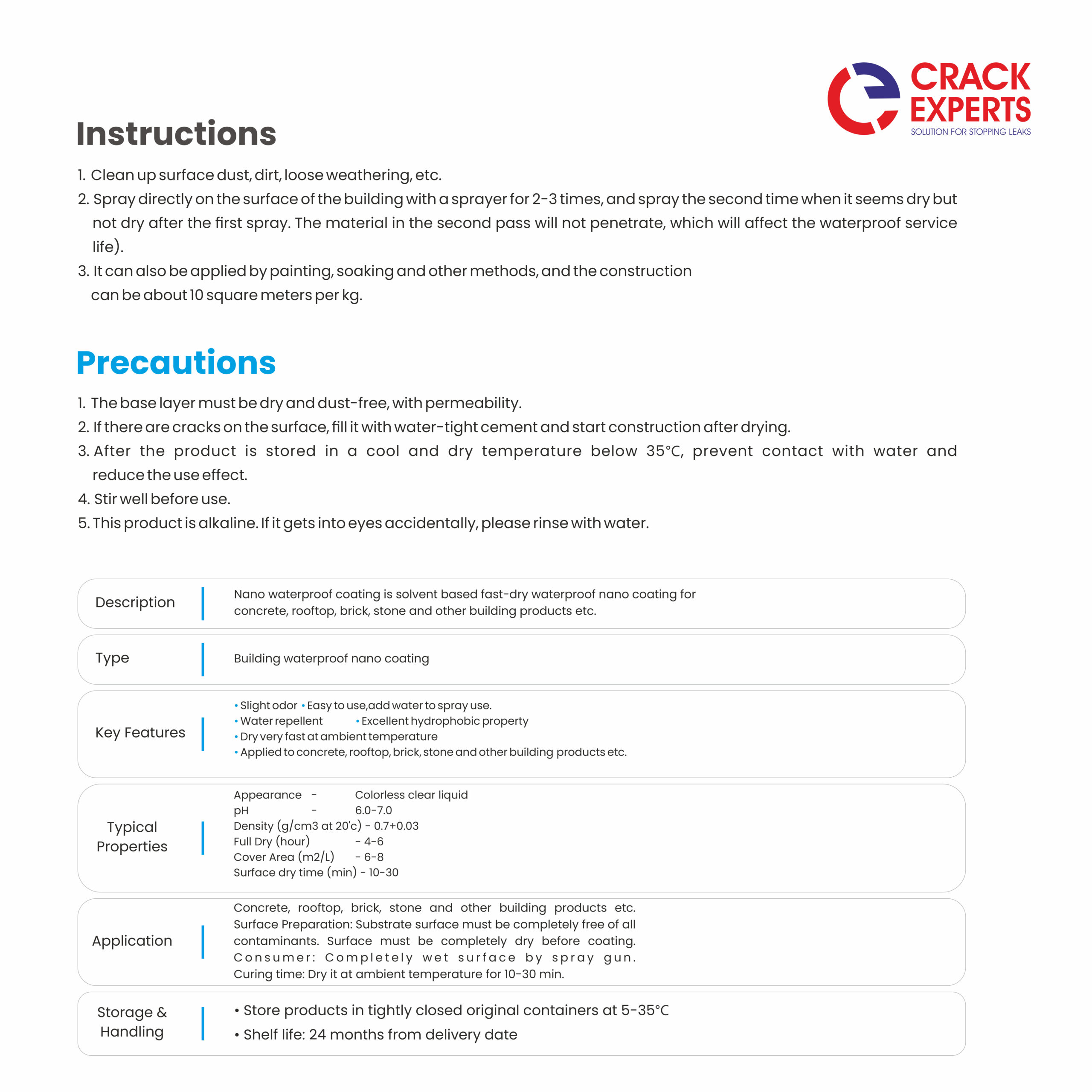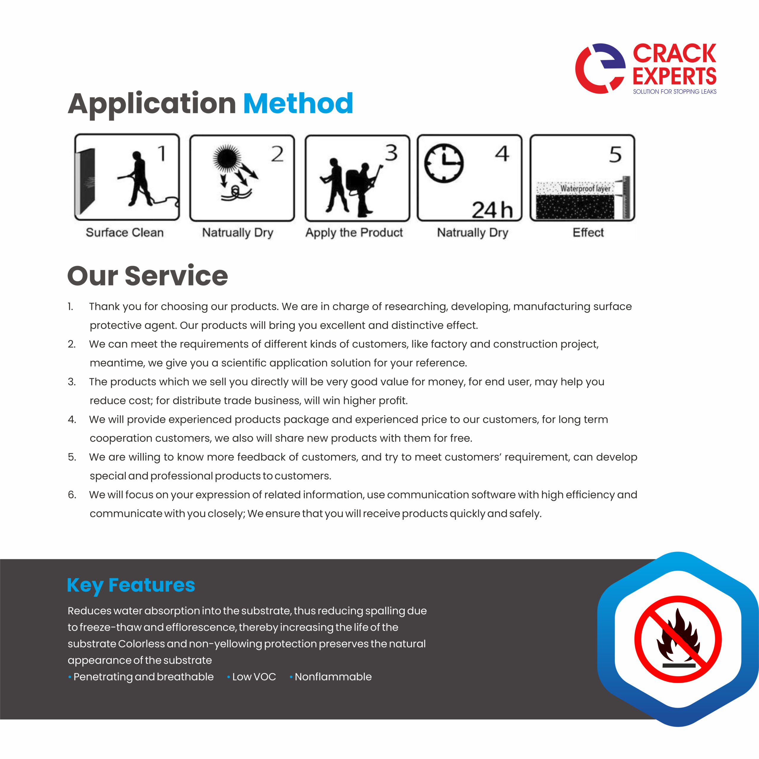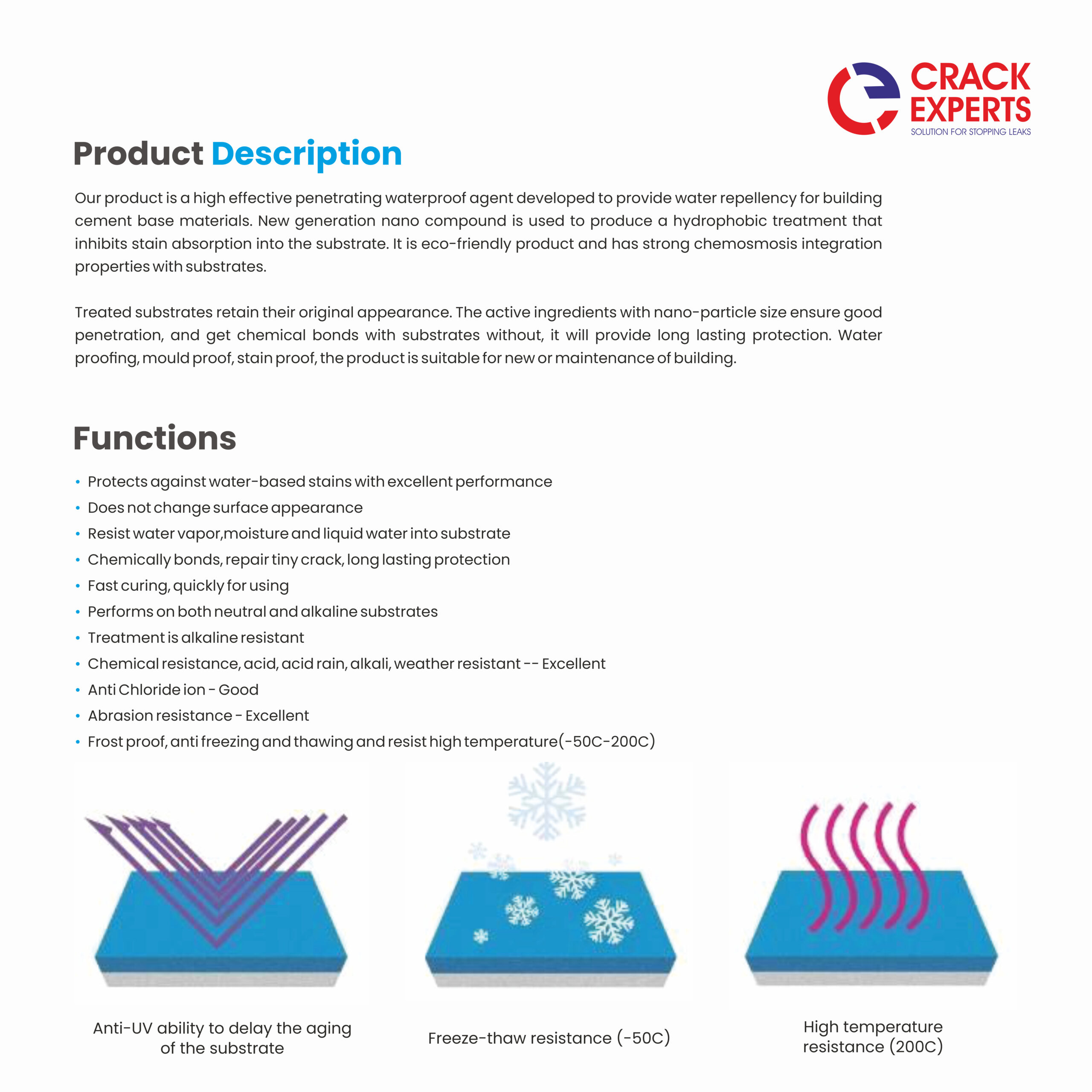 Nano waterproofing agent is a new type of material that is non-toxic, odorless, nonvolatile, non-combustible, and environmentally friendly in colleges and universities. It is a colorless or light yellow liquid. After construction, it can be quickly immersed into the substrate 8-10mm, and cross-linked inside it after uniform diffusion. The reaction forms an environmentally-friendly invisible waterproof layer of breathable interface that is both breathable and waterproof. When water falls on it, the stone does not leave a trace like it falls on a lotus leaf. It has the characteristics of strong penetration, fast film formation, good air permeability, acid and alkali resistance, high temperature resistance, severe cold resistance, weathering resistance, and crack release.And after construction, the surface color of the building is not changed, thereby increasing the service life of the building, and can truly achieve the effect of onetime waterproofing and never “wet”, eliminating the trouble of annual maintenance.