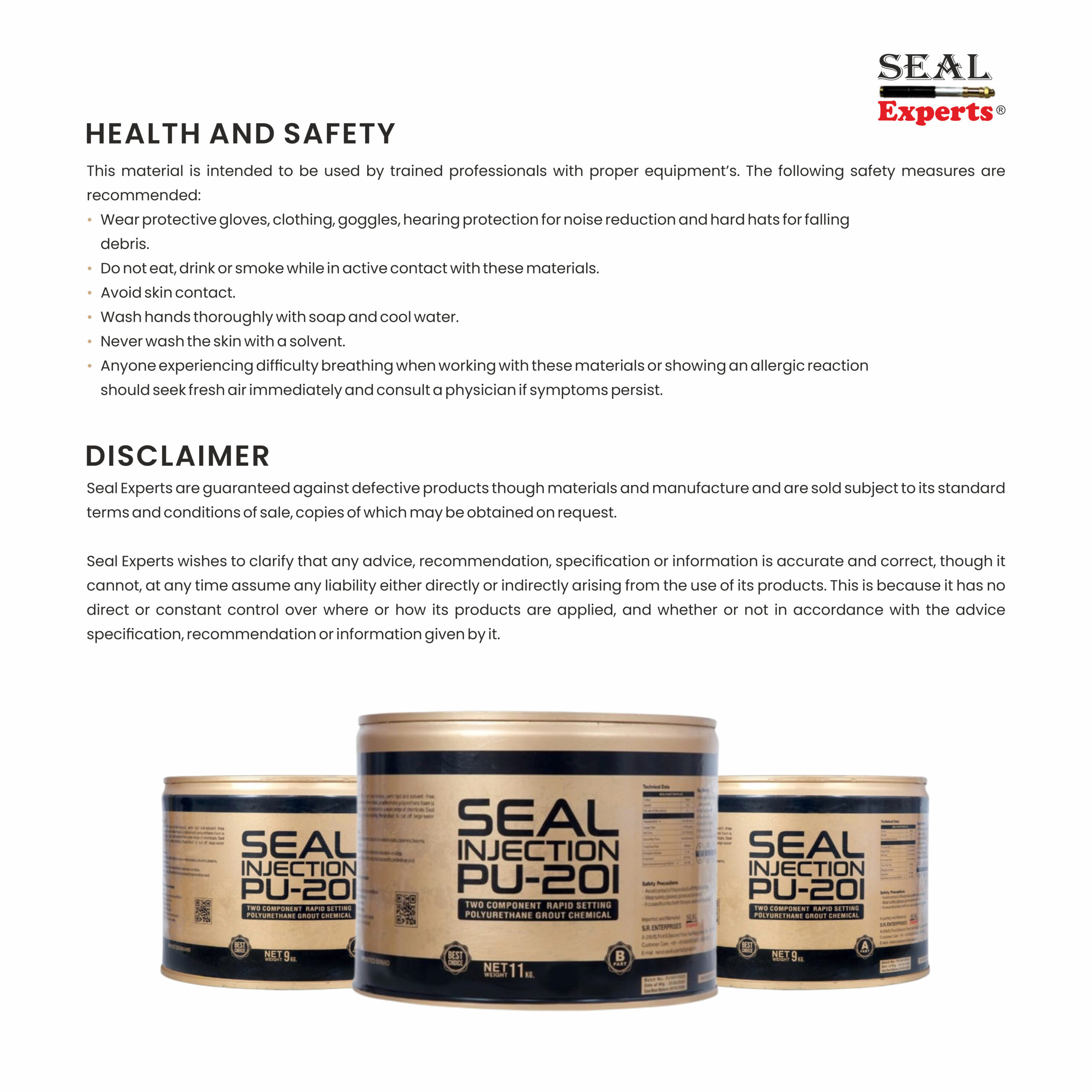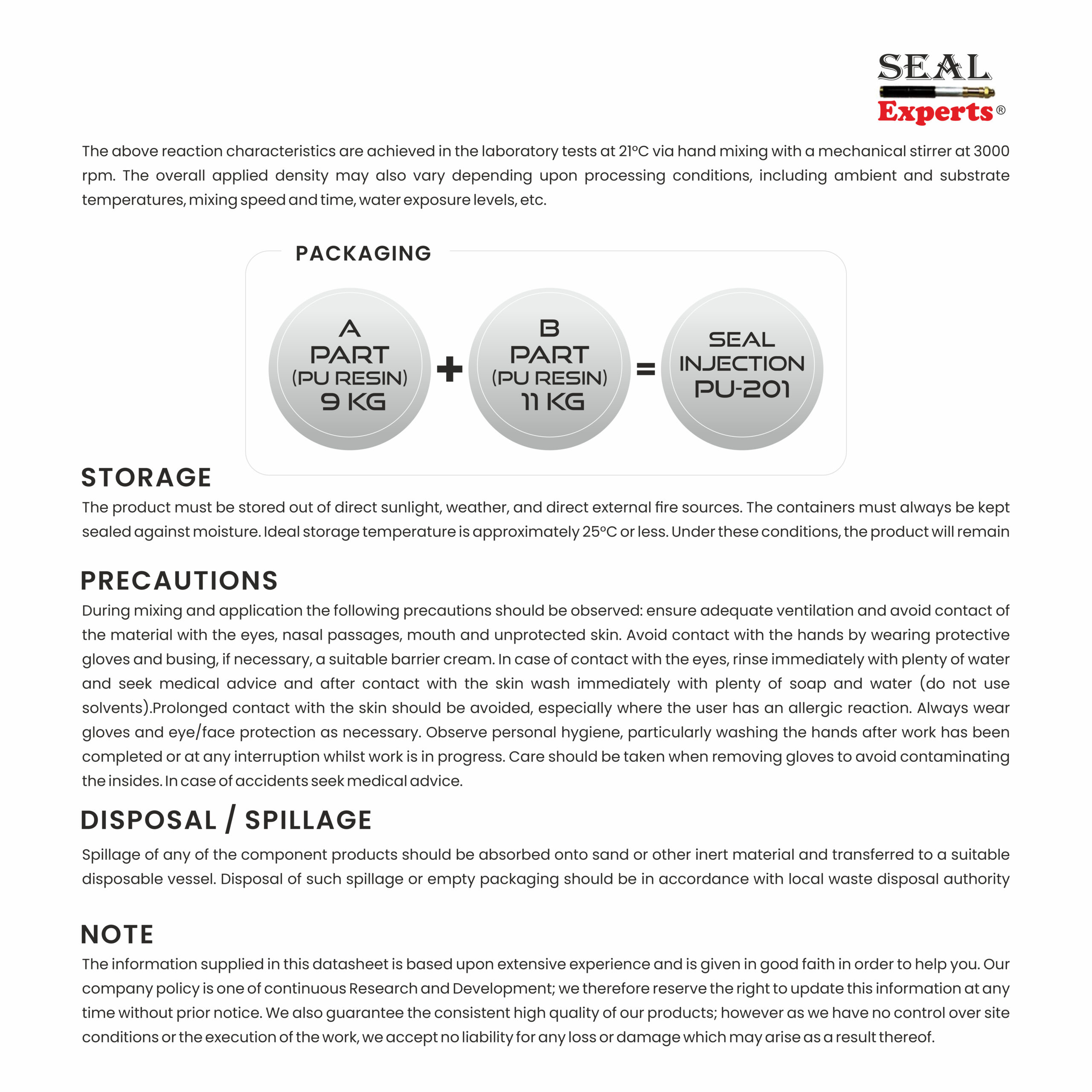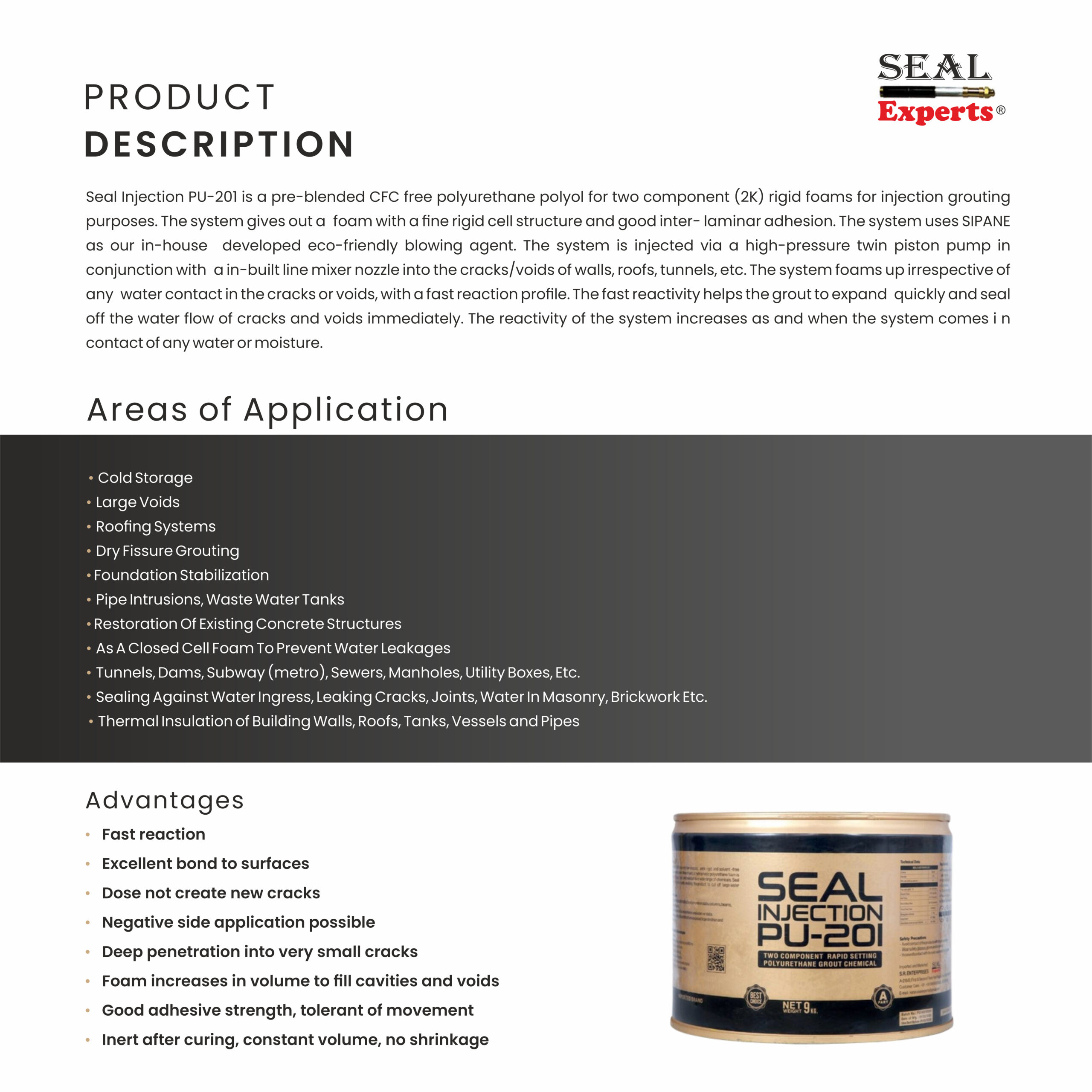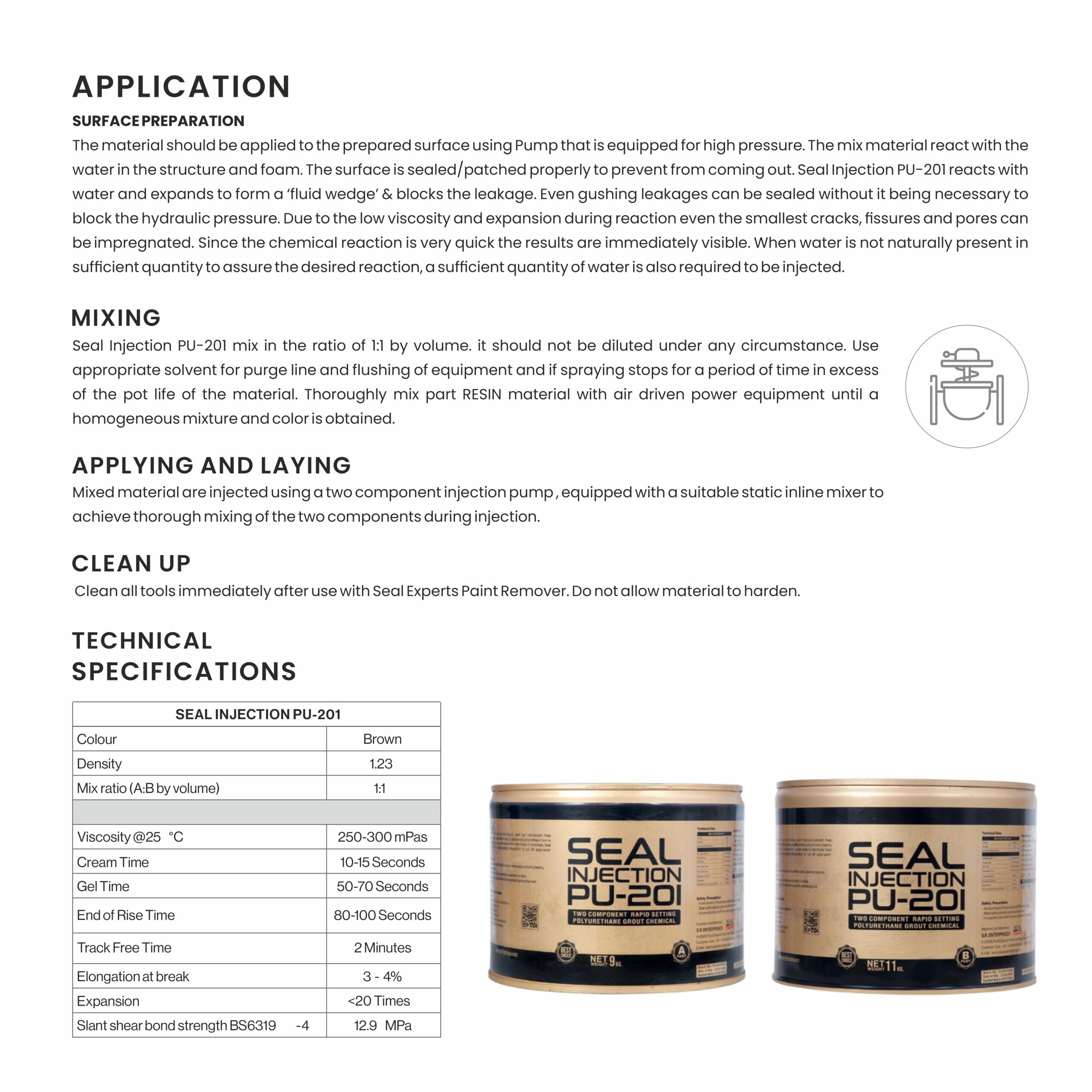 coming out. Seal Injection PU-201 reacts with water and expands to form a ‘fluid wedge’ & blocks the leakage. Even